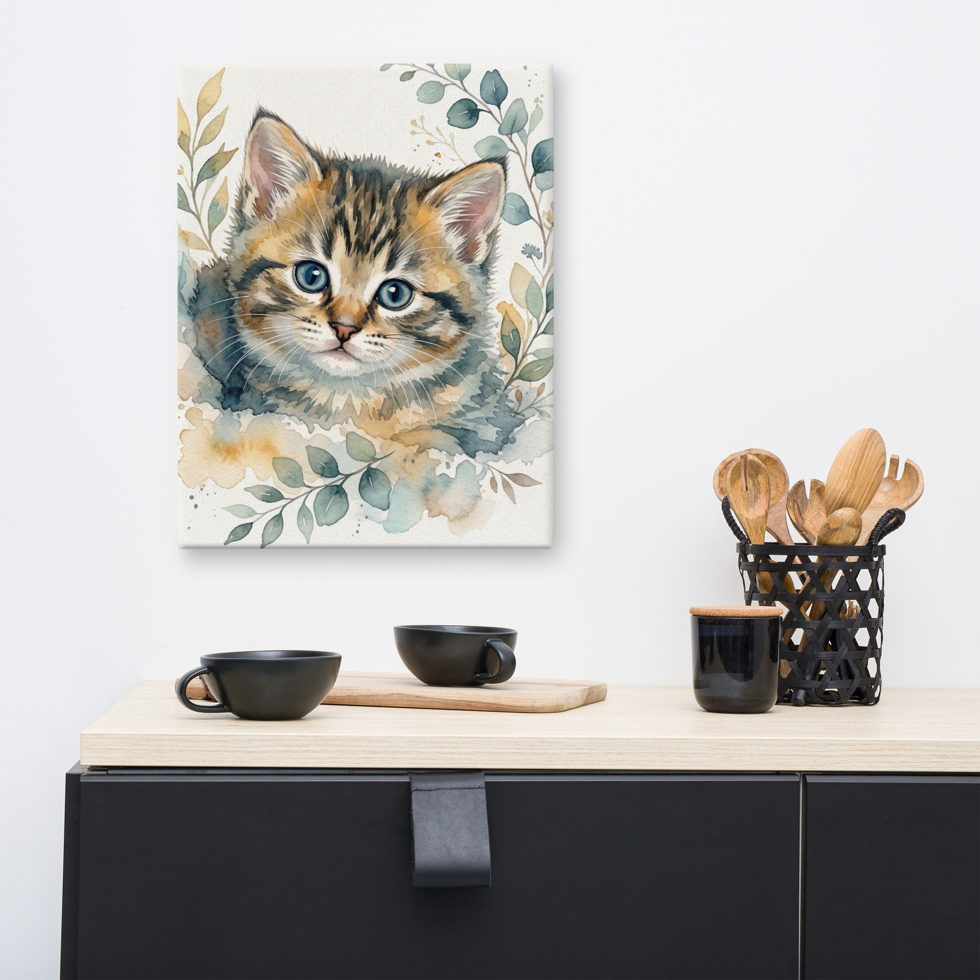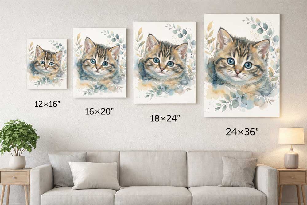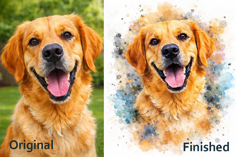 Transform your pet’s photo into a stunning custom watercolour pet portrait printed on premium canvas.