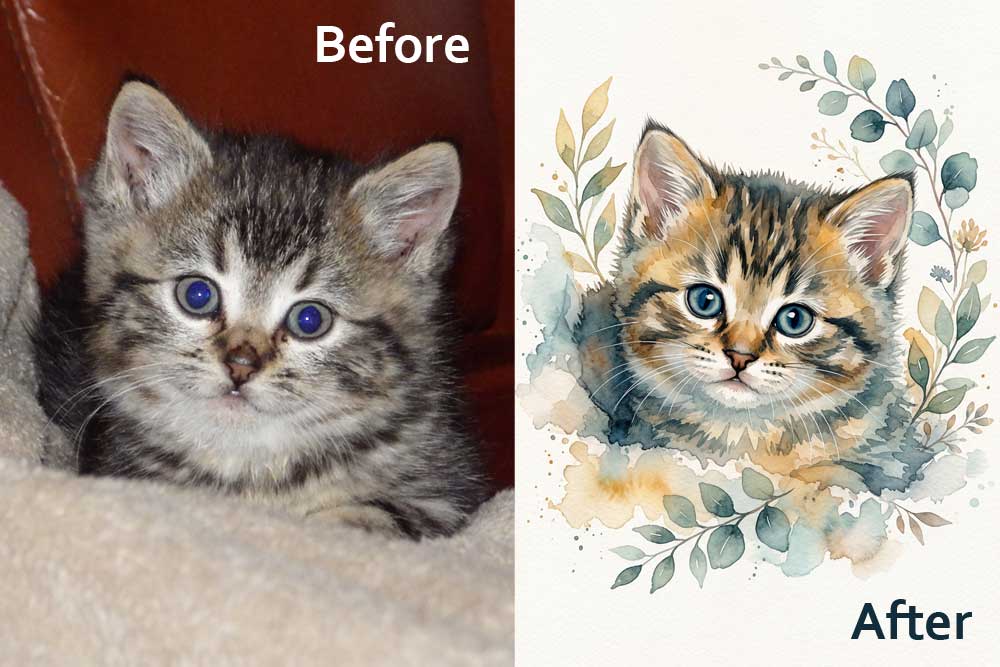 This style uses soft washes of colour and delicate brush effects to create a light, airy look that feels artistic and timeless. Subtle details and gentle tones bring out your pet’s expression while maintaining a relaxed, painterly feel that works beautifully in any home.